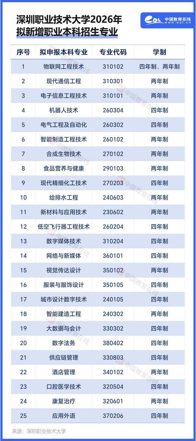 近日,深圳职业技术大学发布《深圳职业技术大学关于2026年拟新增职业本科招生专业的公示》。