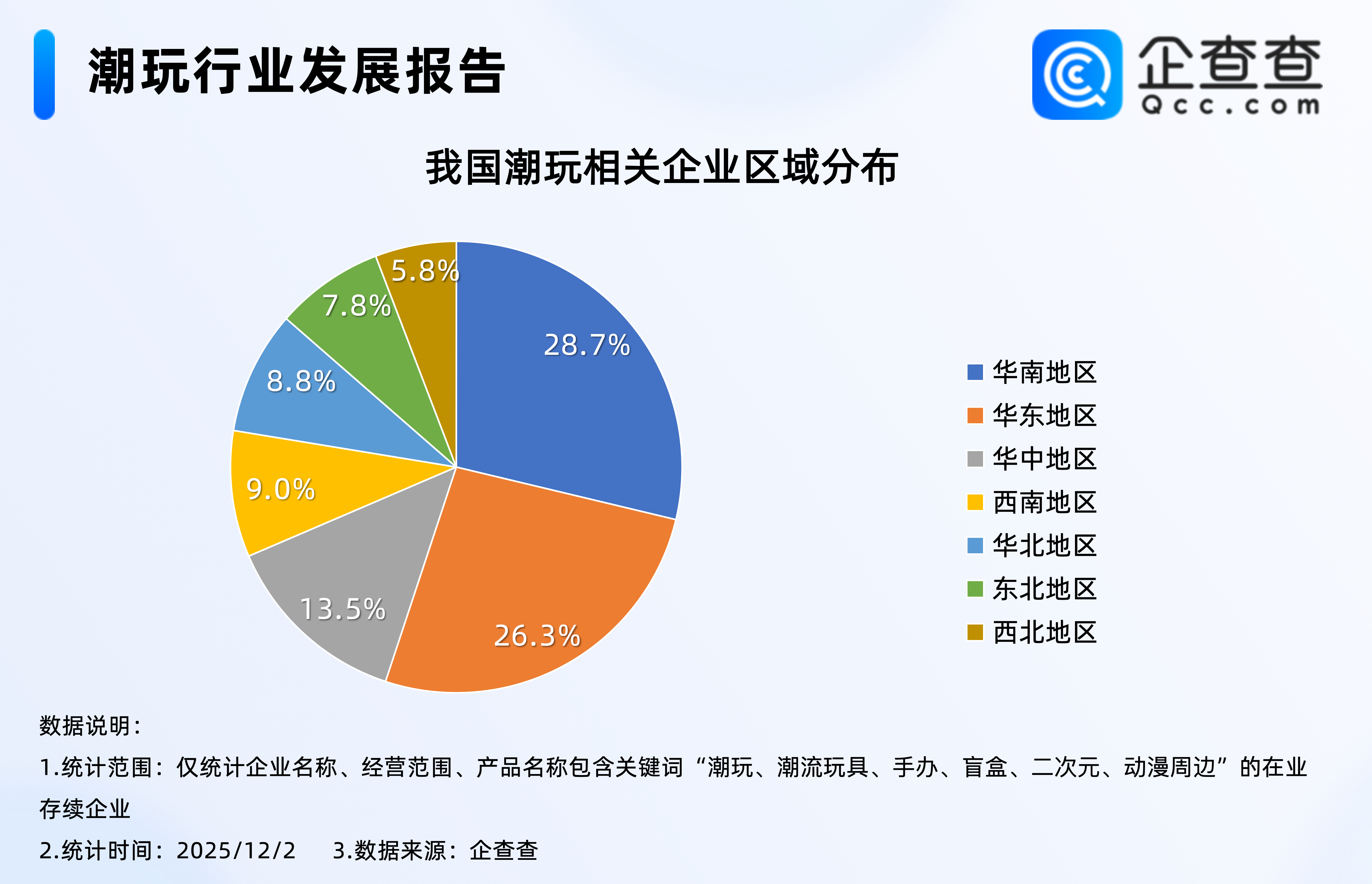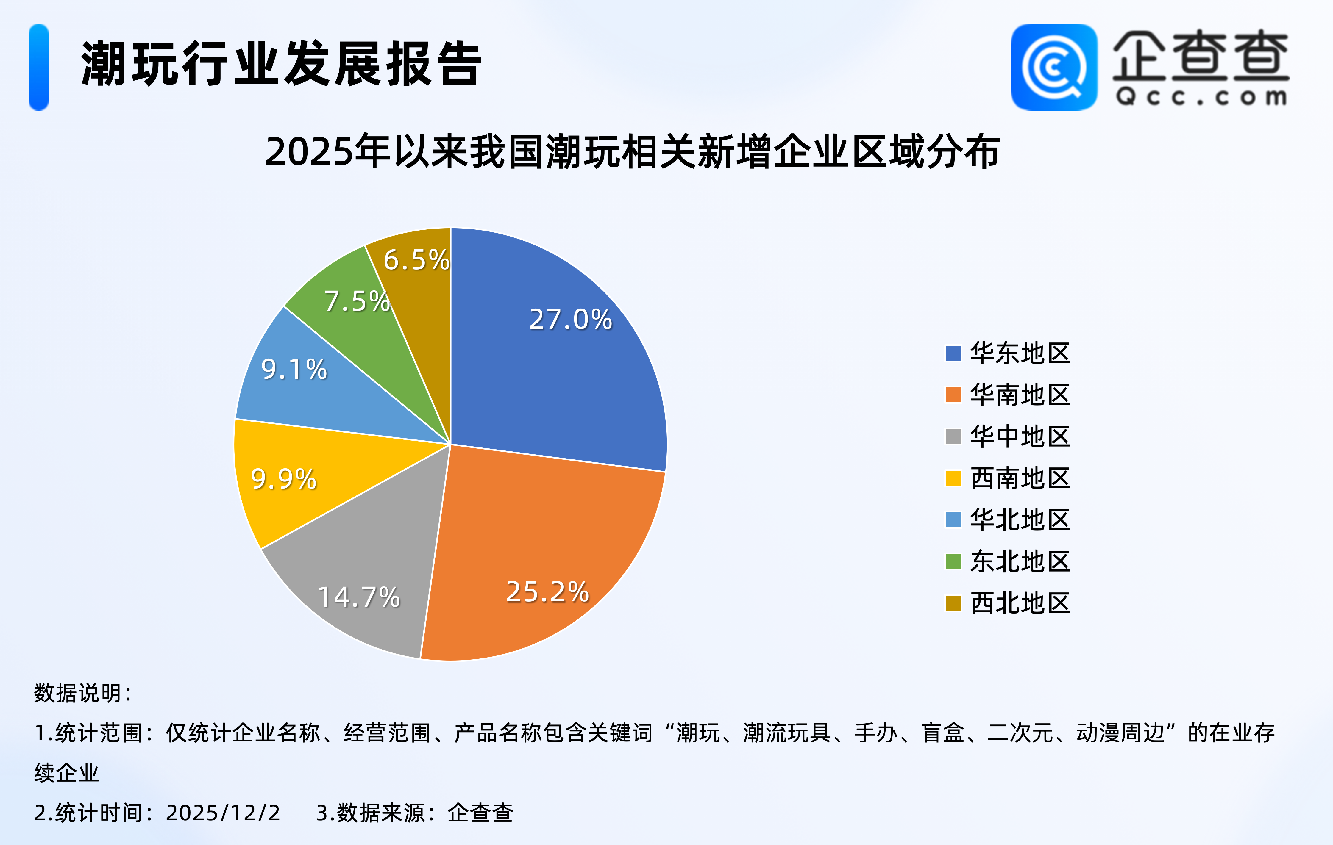 企查查数据显示,2020年以来,我国潮玩相关企业每年注册量逐年增加,2024年全年注册9125家潮玩相关企业,达近五年注册量峰值;截至12月2日,2025年我国已注册9787家潮玩相关企业,已超2024年全年,相比2024年同期增加16.2%。3.从新注册企业区域分布来看:华东超过华南,占比27%
