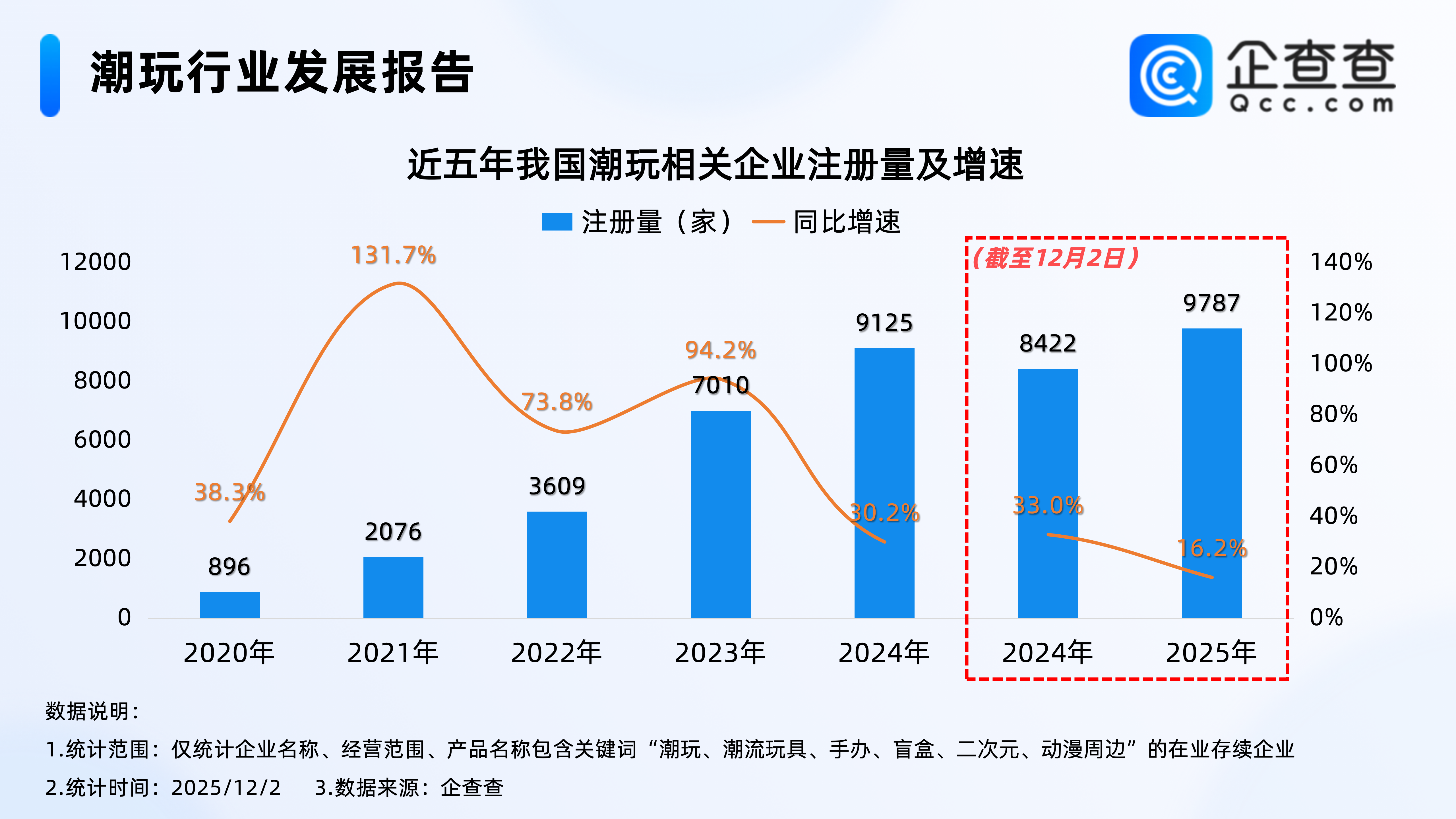 企查查数据显示,截至12月2日,我国现存2.5万家潮玩相关企业,区域分布上,分布在华南地区的相关企业最多,占比28.7%,其次是华东地区,占比26.3%,分布在东北、西北地区的相关企业数量相对较少,分别占比7.8%、5.8%。2.从注册量来看:2025年已注册9787家