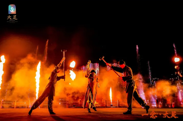 如今,昌州古城片区的“昌州夜宴”已成为夜间经济新地标。《一念·大足》实景水秀运用现代水幕投影技术,再现大足石刻的历史故事与艺术魅力,带来震撼视听体验;宋式天街集聚特色美食、非遗手作、文创产品等业态,市井气息浓厚;百姓广场的中敖打铁花、鲤鱼灯舞等非遗展演,以及昌州戏苑的川剧、杂技演出,让夜间文化生活精彩纷呈。