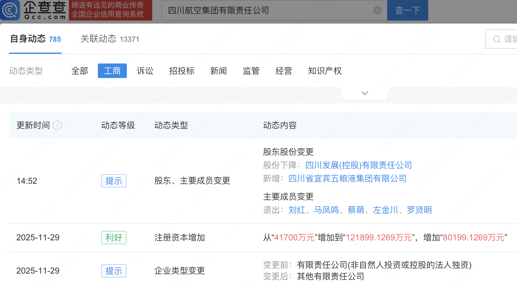 近日,四川航空集团有限责任公司发生工商变更,新增四川省宜宾五粮液集团有限公司为股东,同时注册资本由4.17亿元增至12.19亿元。企查查信息显示,该公司成立于1988年,法定代表人为李越,经营范围包含:通用航空服务;民用航空器维修;房地产开发经营等,现由四川发展(控股)有限责任公司、四川省宜宾五粮液集团有限公司共同持股。