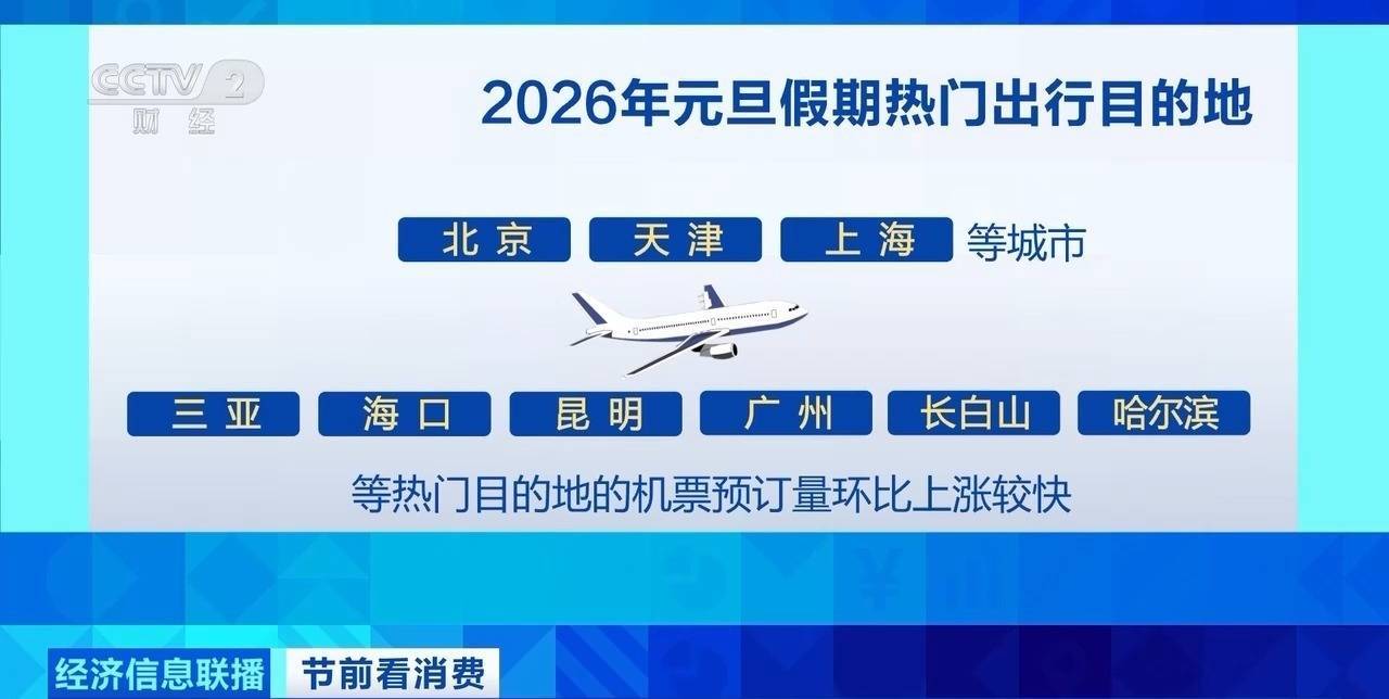 数据显示:2026年元旦假期,从北京、天津、上海等城市飞往三亚、海口、昆明、广州、长白山、哈尔滨等热门目的地的机票预订量环比上涨较快。截至12月25日,国内航线机票预订量超271万张,同比增长约35%。