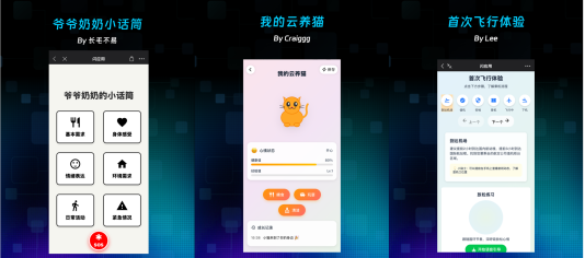 (图说:灵光用户创建的闪应用—爷爷奶奶小话筒、云养猫模拟器、飞行流程模拟器)